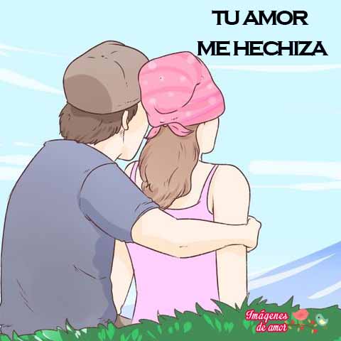 En esta imagen claramente podemos notar el grado de amor que sienten ambos amantes mutuamente, sin embargo la frase que los acompaña “tu amor…me hechiza” dice que disfrutan en momento como se debe, totalmente enamorados.